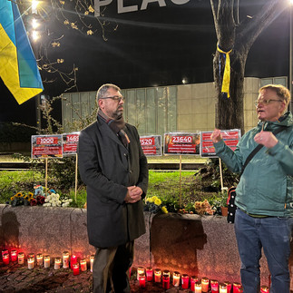 Вечером 19-го ноября мы собрались, чтобы почтить память жертв 1000 дней полномасштабной и почти 9000 дней фактической российской агрессии в Украине. Мероприятие прошло без громких речей, но достаточно эмоционально — у многих собравшихся в глазах стояли слезы. Участники возложили цветы, зажгли свечи и вспомнили погибших.